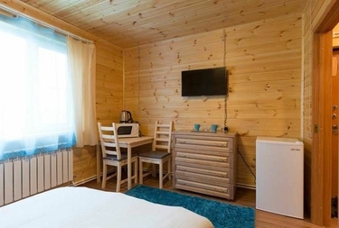 Номер однокомнатный с крытой верандой и пирсом 20 кв.м. для двоих человек, с санузлом, двумя односпальными кроватями, софой, журнальным столиком, шкафом, телевизором, холодильником, кондиционером, чайником, посудой для чая, бельем.