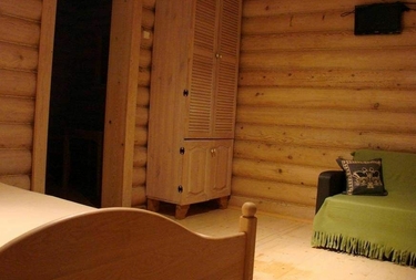 Первая комната домика 40 кв.м. В ней имеется кухонный уголок с газовой плиткой, микроволновкой, чайником,холодильником; имеется вся посуда для сервировки стола и приготовления пищи , большой стол, угловой диван, телевизор, сплит система. Камин! Вторая комната 7.5 кв.м. оснащена деревянной кроватью, шкафом. Имеется санузел с туалетом и душем.