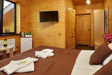 Комфортабельные номера. Прекрасно подходит для молодых пар. Большая французская кровать, прекрасный вид на горы и кроны заснеженных вершин а так же номера из бруса, так не похожие на душные квартиры города сделают Ваш отдых незабываемым.